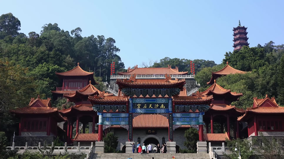 廣州南沙天后宮,又叫“媽祖廟”,位于廣東省廣州市南沙區(qū)天后路88號,坐落于大角山東南麓,地處粵港澳大灣區(qū)之心,瀕臨珠江出?诘牧尕暄螅嫉孛娣e達(dá)18萬平方米。廣州南沙天后宮前身是明代建于鹿頸村的天妃古廟,清乾隆年間經(jīng)重修定名為元君古廟,抗戰(zhàn)時期被日寇飛機炸毀,而后于1994年重建。廣州南沙天后宮是為紀(jì)念海上女神林默而建,是一個以媽祖文化為主題的景區(qū),是粵港澳大灣區(qū)媽祖文化交流中心,亦是東南亞最大之媽祖廟。廣州南沙天后宮采用清式建筑對稱布局,高低錯落地依山而建,建筑的特點集北京故宮的風(fēng)格和南京中山陵的氣勢于一體,規(guī)模為現(xiàn)今世界同類建筑之最。廣州南沙天后宮由廣場、宮殿和南嶺塔三部分構(gòu)成,“天后八景”包括:濱海銀灘朝陽、五彩靈徑、媽祖靈釵、“南沙人”遺址、靈宮賜福、南嶺夕照、抗戰(zhàn)神炮、默娘之家八個景點。