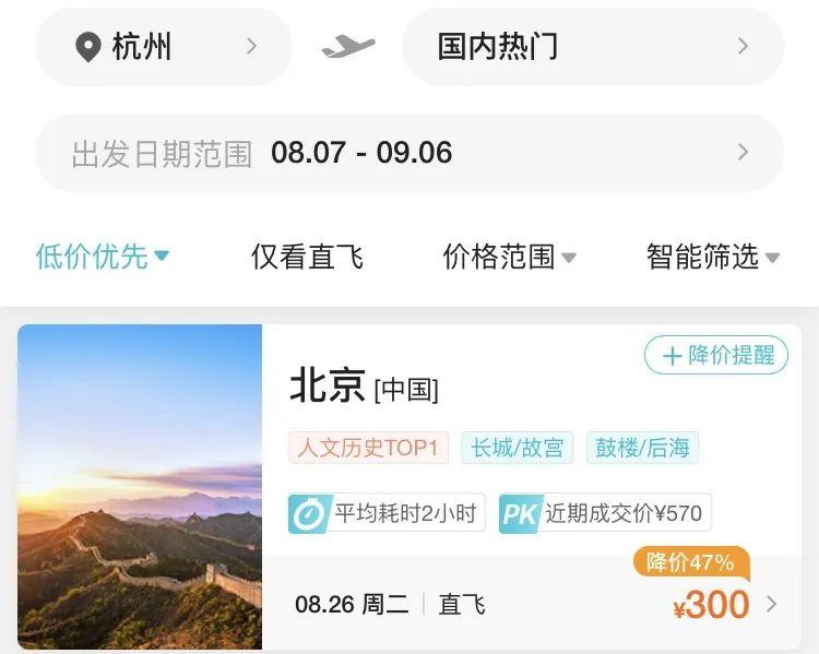 8月7日,記者查詢第三方售票平臺發(fā)現(xiàn),8月26日杭州飛北京經(jīng)濟(jì)艙機(jī)票價格僅需300元(不含稅),相當(dāng)于打了1.3折。8月13日,杭州飛揭陽經(jīng)濟(jì)艙票價最低僅需370元(不含稅),相當(dāng)于打3.1折。8月27日,杭州出發(fā)飛石家莊票價最低僅需330元(不含稅),相當(dāng)于打2折。