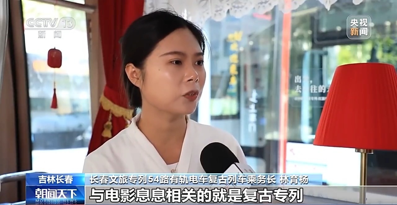 長春文旅專列54路有軌電車復古列車乘務長 林育楊:與電影息息相關的就是復古專列。它的起始站就是長影舊址博物館,途經(jīng)東風大街、創(chuàng)業(yè)大街、南陽路,都是熱播劇的取景地。