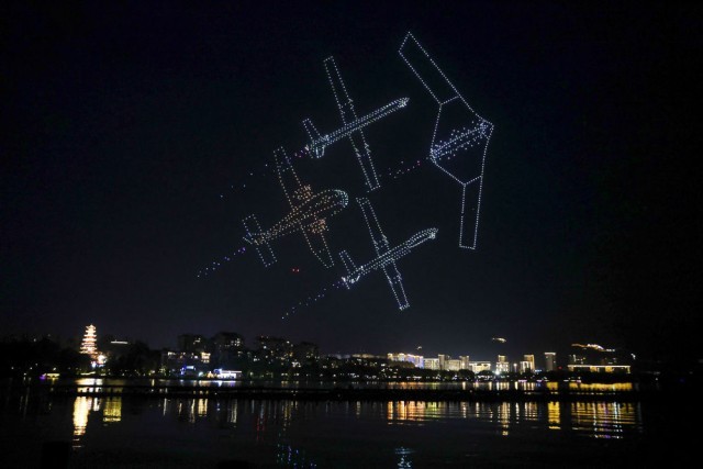 這是7月11日晚在重慶市梁平區(qū)雙桂湖國(guó)家濕地公園拍攝的無(wú)人機(jī)表演。新華社記者 黃偉 攝