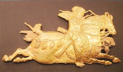 吐蕃騎射武士形飾牌造型威武,動(dòng)感十足,格外引人注目。騎者纏頭巾,頭巾下方兩條發(fā)辮隨風(fēng)飛舞,雙目圓瞪,嘴下有濃密的絡(luò)腮胡須;身穿緊身三角形大翻領(lǐng)長(zhǎng)袍,雙手拉弓欲射,腰部系帶,其上垂掛箭囊,腰后露出刀柄。馬尾打有結(jié)扣,杏葉凌空飛動(dòng),氣勢(shì)撼人。金飾牌背面殘存帶黑漆皮的薄木片,上面有金釘將飾牌與木片定綴在一起,可知此飾牌原來(lái)應(yīng)為某件木質(zhì)器皿上的裝飾物。“這件飾牌的造型受到西亞薩珊王朝金銀器上的帝王狩獵圖影響,而騎士的裝束卻是吐蕃風(fēng)格,體現(xiàn)了文化的交融。”趙婧說(shuō),青海省都蘭縣熱水墓群出土了相似的騎射形金飾片,亦為吐蕃時(shí)期的器物。