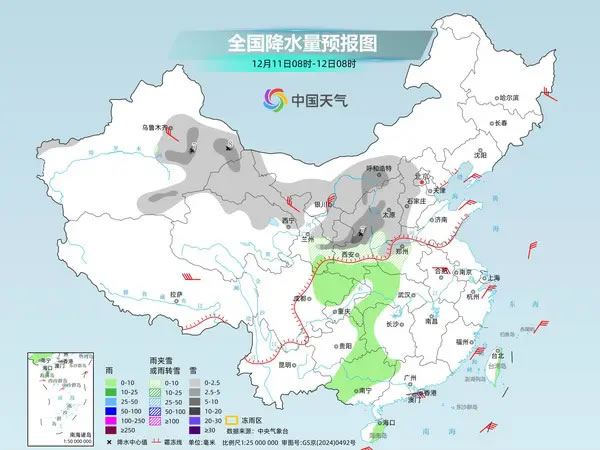 在這次寒潮過程中,由于水汽條件較好,我國將出現(xiàn)大范圍的雨雪天氣,這將是立冬以來最大規(guī)模的雨雪天氣。預計今起至13日,新疆、西北地區(qū)、華北、黃淮中北部、內(nèi)蒙古中部及東北地區(qū)中南部等地有小到中雪或雨夾雪,部分地區(qū)有大雪,新增積雪深度2至8厘米,局地可達10至15厘米;四川盆地、江漢、黃淮南部及其以南地區(qū)有小到中雨,局地大雨。