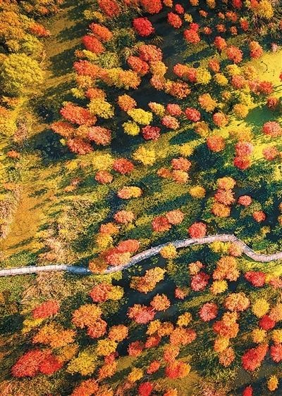 清晨,霧氣氤氳,成片的池杉樹在水中矗立。初冬時(shí)節(jié),池杉湖國(guó)家濕地公園層林盡染,眾多鳥兒從北方飛回,吸引眾多游客前來(lái)觀賞。