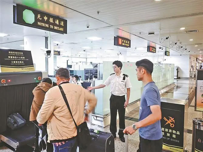 廈門(mén)機(jī)場(chǎng)海關(guān)關(guān)員對(duì)進(jìn)境旅客開(kāi)展監(jiān)管作業(yè)。(通訊員 于挺洋 攝)