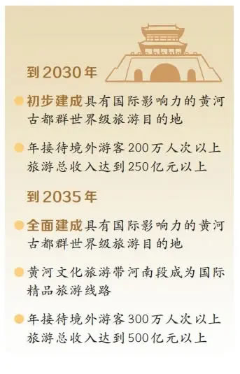 《規(guī)劃》設(shè)定的雙階段目標,為黃河古都群的發(fā)展錨定了清晰航向。到2030年,初步建成具有國際影響力的黃河古都群世界級旅游目的地,年接待境外游客200萬人次以上,旅游總收入達到250億元以上;到2035年,全面建成具有國際影響力的黃河古都群世界級旅游目的地,黃河文化旅游帶河南段成為國際精品旅游線路,年接待境外游客300萬人次以上,旅游總收入達到500億元以上。