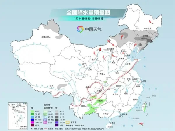 后天,新疆北部和西南部、西藏西部、黑龍江北部、四川西部等地部分地區(qū)有小到中雪或雨夾雪,其中,新疆沿天山地區(qū)和伊犁河谷等地部分地區(qū)有大雪或暴雪。湖北中南部、湖南西部和北部、重慶、貴州、廣西北部、云南南部等地部分地區(qū)有小到中雨。