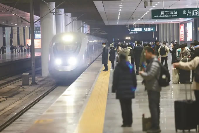 從1月26日零時(shí)起,全國(guó)鐵路實(shí)行新的列車運(yùn)行圖,調(diào)圖后,圖定旅客列車較原圖增加243列。京滬高鐵標(biāo)桿列車G25次迎來了“瘦身”升級(jí):這趟京滬間最快高鐵取消原有5個(gè)?空荆瑑H設(shè)南京南站唯一經(jīng)停點(diǎn)。圖為當(dāng)日晚,旅客在南京南站準(zhǔn)備乘坐G25次列車。(陳儼 攝)