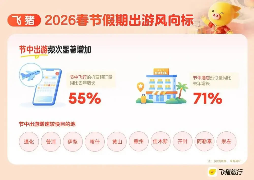 美團旅行數(shù)據(jù)顯示,2026年春運期間,“反向過年”的車票預訂量增長明顯。2月初至2月中下旬,“反向過年”的機票預訂量同比增長84%。春節(jié)假期的火車票雖未開售,預約單量也增長過半。從機票的預訂情況看,“反向過年”Top10熱門目的地為北京、上海、成都、重慶、廣州、深圳、昆明、西安、杭州、天津。