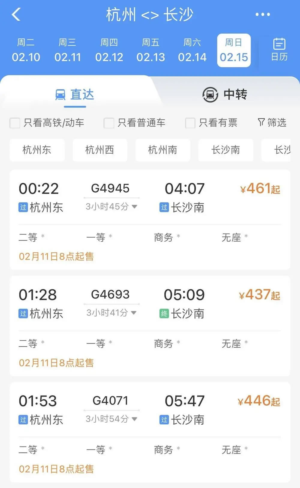 比如,2月15日杭州前往武漢、長沙、南昌、貴陽等地,無論是普速列車還是動車組列車,當(dāng)天所有車次已經(jīng)基本全部售罄,只剩極個別車次硬座、無座席位還有余票。