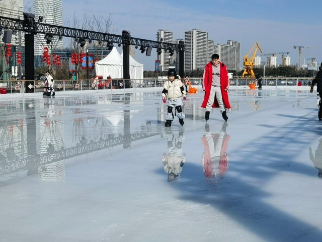在上海徐匯濱江西岸夢中心,面積約為1500平方米的戶外水岸冰場充滿歡聲笑語。即便是工作日,也有不少家長帶著放寒假的孩子前來滑冰。