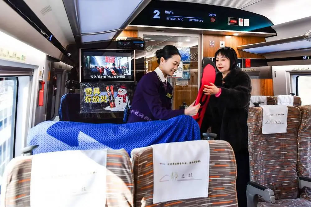 旅客可通過鐵路12306官方客戶端內(nèi)的“雪具便利行”功能,查詢服務(wù)車次、辦理預(yù)約并支付相關(guān)費(fèi)用后即完成辦理。辦理成功后,旅客可在乘車當(dāng)日將妥善包裝的雪具帶至車站,經(jīng)設(shè)有“雪具便利行”標(biāo)識的通道進(jìn)行安檢和驗(yàn)票,車站工作人員將同步核驗(yàn)車票與雪具運(yùn)送預(yù)約信息。上車后,旅客可在列車工作人員引導(dǎo)下,將雪具放置于鄰近的“雪具存放區(qū)”。列車運(yùn)行期間,工作人員將定時(shí)巡檢,共同保障雪具安全。