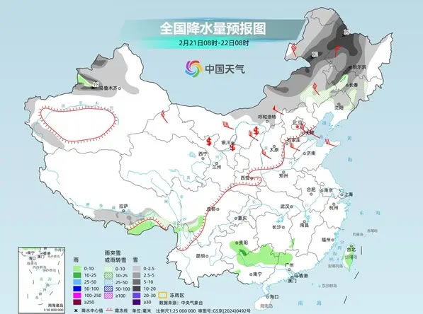 后天,內(nèi)蒙古東北部、東北地區(qū)大部、新疆南疆盆地和北部、西藏東部和南部、甘肅東部、寧夏南部、山西南部等地部分地區(qū)有小到中雪或雨夾雪,其中,黑龍江北部等地部分地區(qū)有大到暴雪。西北地區(qū)東南部、黃淮西部、江漢大部、江南中西部、西南地區(qū)東部、華南北部和西部等地部分地區(qū)有小到中雨,其中,湖南西部、重慶東南部、貴州東部、廣西北部等地部分地區(qū)有大雨。
