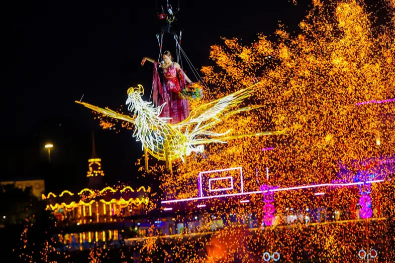 重慶歡樂谷舉行了新春大妙會活動,集水陸空立體非遺大秀、百場非遺演藝、多種民俗互動、年味萬福市集等于一體,以傳統(tǒng)與現(xiàn)代碰撞的獨特魅力為游客奉上沉浸式的地道年味體驗。其中,非遺大秀在夜幕中璀璨亮相,1600℃的鐵水揮灑成漫天花火,演員化身“天女”撒下花瓣雨,湖面的龍船、火鳳凰、風(fēng)火輪等裝置火光綻放,光影成趣,水陸空一體聯(lián)動,驚艷絕倫;川劇變臉、潮汕英歌舞、福建游神、電音三太子等百場非遺演藝,讓游客可一站式領(lǐng)略全國傳統(tǒng)文化魅力,吸引絡(luò)繹不絕的游客前往。