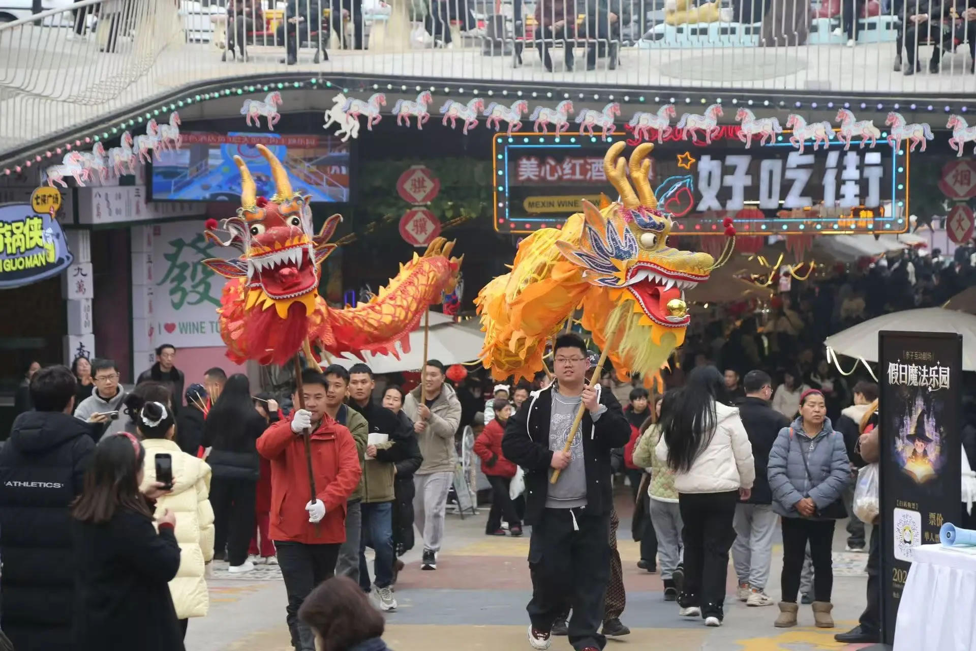 涪陵美心紅酒小鎮(zhèn)景區(qū)更是打破傳統(tǒng)景區(qū)“臺上表演、臺下觀看”的模式,全面轉(zhuǎn)向以游客為主導(dǎo),全民參與、沉浸式互動的新春玩法,把游客真正“寵”進濃濃年味里。除了舞龍舞獅、民俗巡游、財神送福等經(jīng)典項目外,游客還可以穿戲服、持龍具、跟著鼓點一起巡游,親身感受傳統(tǒng)年俗的熱鬧與儀式感,從“圍觀者”變身“參與者”,讓年味更足、歡樂加倍。15日至17日,景區(qū)人氣持續(xù)火爆,日均接待游客超6萬人次,成為重慶近郊新春出游的熱門之選。