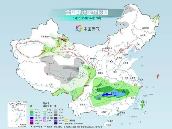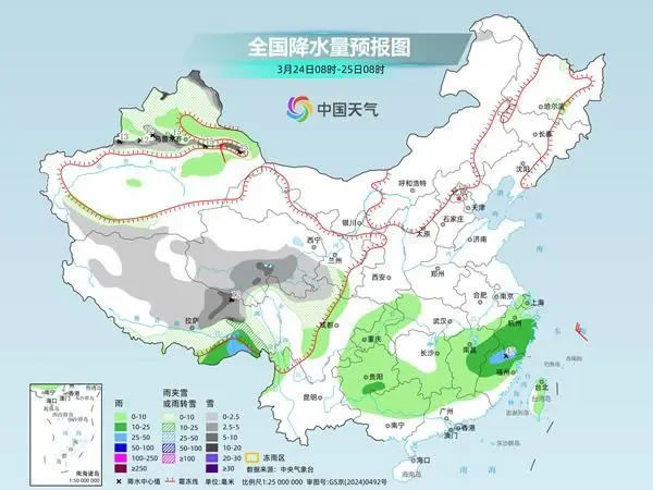 具體來看,中央氣象臺預(yù)計,今天,新疆北疆北部和沿天山地區(qū)、西藏北部和東部、青海東部和南部、川西高原中北部等地部分地區(qū)有小到中雪或雨夾雪,其中,新疆北疆阿勒泰山區(qū)和沿天山地區(qū)、西藏東北部、青海東南部等地部分地區(qū)有大到暴雪。江漢西部、江南大部、西南地區(qū)東部、華南北部、臺灣島東部等地部分地區(qū)有小到中雨,其中,浙江南部、福建北部等地部分地區(qū)有大雨。