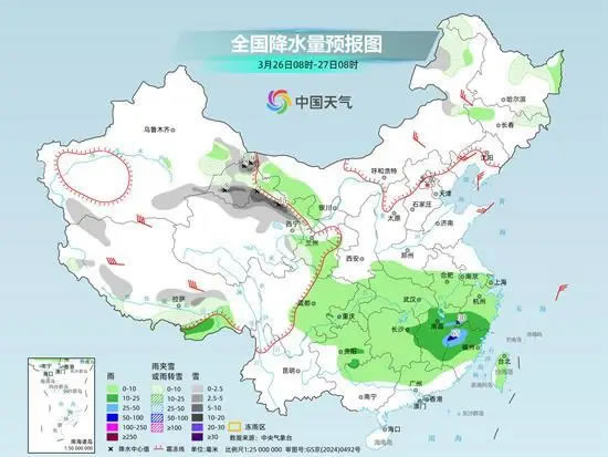 未來三天,南方仍有較大范圍陰雨天氣,西南地區(qū)東部、江南、華南北部等地有中到大雨,貴州中南部、湖南中部、江西中部、福建北部等地局地有暴雨,上述地區(qū)局地伴有短時強降水或風雹天氣。此外,青藏高原東部多雨雪天氣,新疆沿天山高海拔山區(qū)有中到大雪,局地有暴雪或大暴雪。