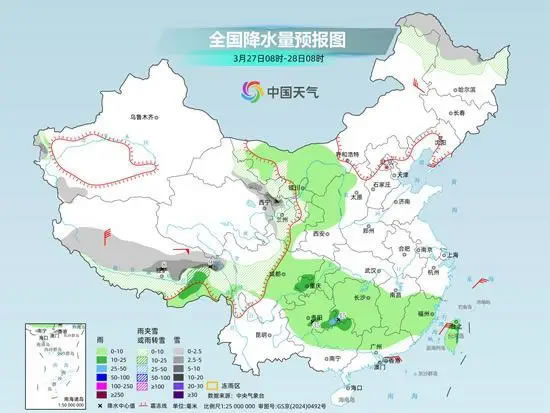 具體來看,中央氣象臺預計,今天,新疆東南部和沿天山地區(qū)東段、西藏東部、甘肅西部、青海大部、川西高原中北部、內(nèi)蒙古東北部等地部分地區(qū)有小到中雪或雨夾雪,其中,新疆東南部和沿天山地區(qū)東段、青海東部、甘肅西南部等地部分地區(qū)有大到暴雪,局地大暴雪;江南中西部、貴州東部、西藏東南部等地部分地區(qū)有中到大雨,其中,貴州中部、湖南中部等地部分地區(qū)有暴雨。