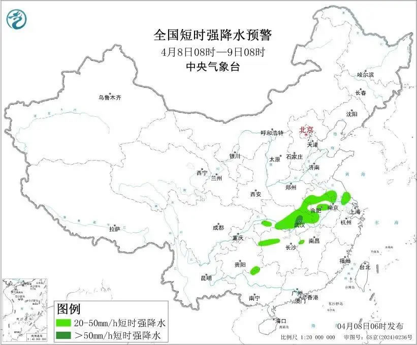 預(yù)計(jì),4月8日8時(shí)至9日8時(shí),湖北南部和東部、安徽中北部、河南南部、江蘇中北部等地部分地區(qū)有大到暴雨,其中,湖北東部局地有大暴雨(100~150毫米)。上述部分地區(qū)伴有短時(shí)強(qiáng)降水(最大小時(shí)降雨量20~40毫米,局地可超過(guò)50毫米),局地有雷暴大風(fēng)或冰雹等強(qiáng)對(duì)流天氣。